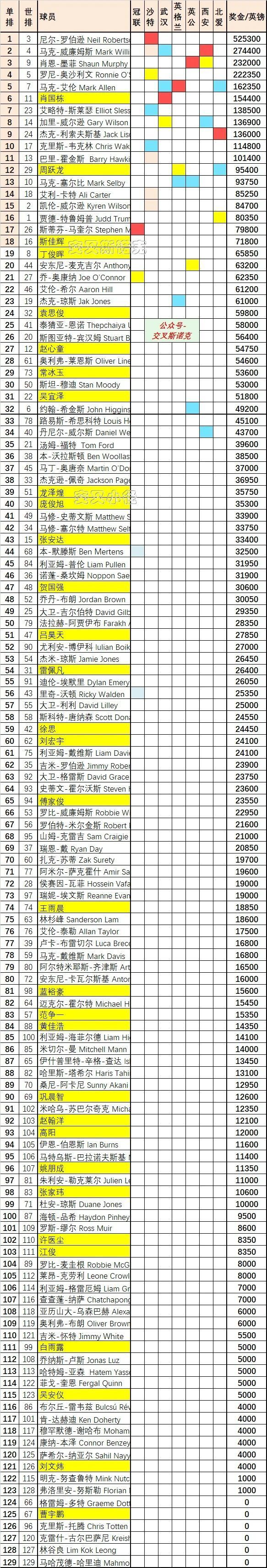 (1)前两栏,分别是球员的单赛季排名和现世界排名(北爱公开赛后);赛事栏,红标冠军,黄标亚军,蓝标四强;沙特栏,粉标八强。